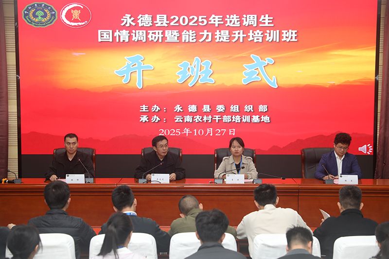 10月27日,由永德县委组织部主办,继续教育学院(云南农村干部培训基地)承办的永德县2025年选调生国情调研暨能力提升培训班在成教楼报告厅开班。继续教育学院党支部书记、云南农村干部培训基地副主任普文龙致辞,临沧市永德县委组织部部务委员、县公务员局局长李燕作开班动员讲话,继续教育学院(云南农村干部培训基地)培训办杨涛老师出席,继续教育学院(云南农村干部培训基地)张伟老师主持。来自永德县的19名学员参加本期培训。