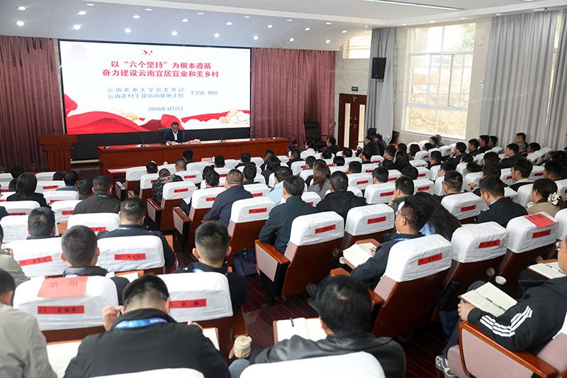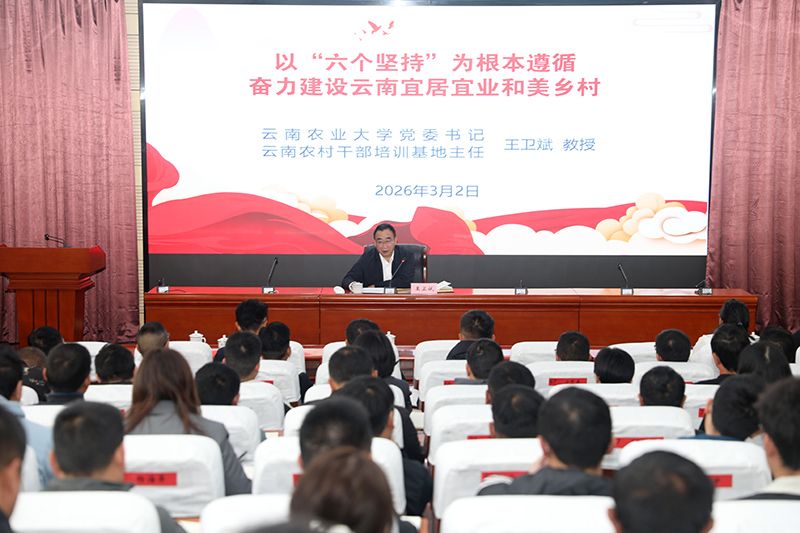 2026年3月2日上午,云南农业大学党委书记、云南农村干部培训基地主任王卫斌教授为培训基地2026年春季学期第一期培训班学员讲授题为《以"六个坚持"为根本遵循 奋力建设云南宜居宜业和美乡村》的"开学第一课"。云南农业大学继续教育学院院长、云南农村干部培训基地副主任杨金江主持。宜居宜业和美乡村建设专题培训班的129名乡镇分管村庄建设培训班学员、学院(基地)教职工聆听了第一课。